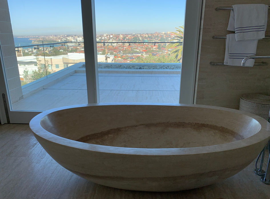The floor was tiled in 600x300 travertine, while the shower wall featured a spacious full length niche all done in pure creama marble.